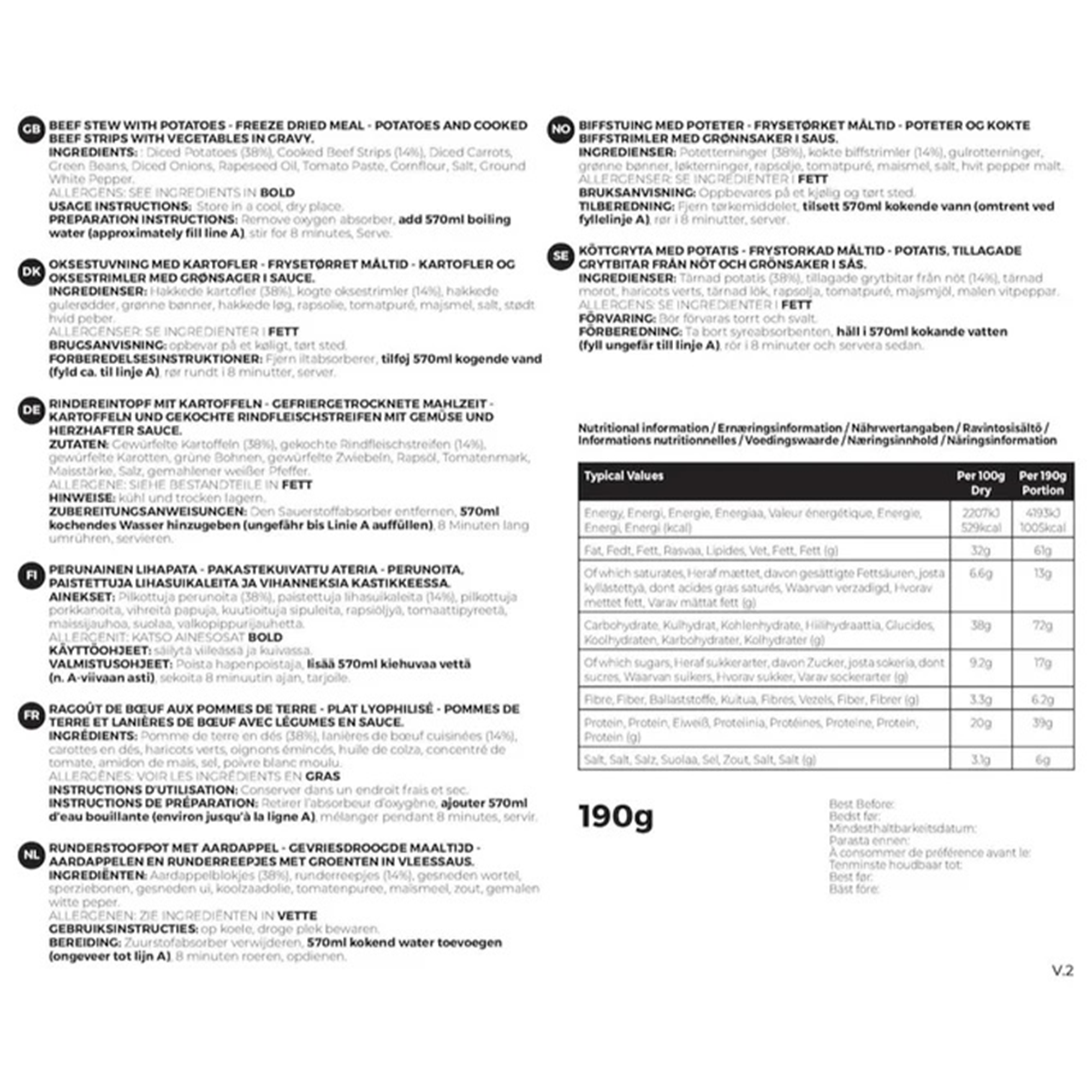 | Složení: | brambory (38%), dušené hovězí maso (14%), mrkev, zelené fazolky, cibule, řepkový olej, rajský protlak, kukuřičná mouka, sůl, bílý pepř |